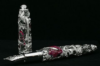 Uma parceria da loja de jóias e relógios Van Cleef & Arpels com a grife de presentes Montblanc fizeram a caneta mais cara do mundo.Ainda acho que podiam ter feito algo mais criativo mas...Pois é O nome da caneta é Mystery Mastepiece, e é feita por encomenda, de ouro branco adornada de rubis, safiras ou esmeraldas –do jeito que você preferir - e com uma pequena cobertura de 840 pequenos diamantes, para dar o toque final.